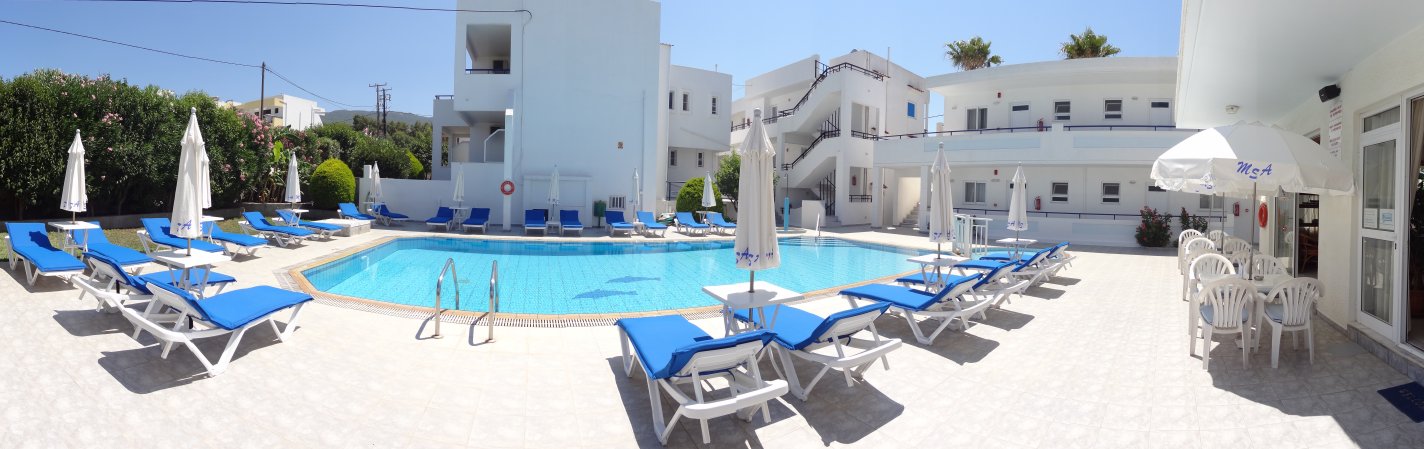 There are studios, one bedroom apartments and two bedroom apartments catering for two to four persons. Our place is 300 metres from the beach, opposite a bus stop, 1km from the Marina, close to restaurants, supermarkets and popular windsurfing centres. There is a snack bar next to the pool where breakfast can be ordered, snacks and drinks are served throughout the day. With many amenities at hand we offer our guests a relaxed environment and friendly atmosphere and provide all the information for a holiday to remember!